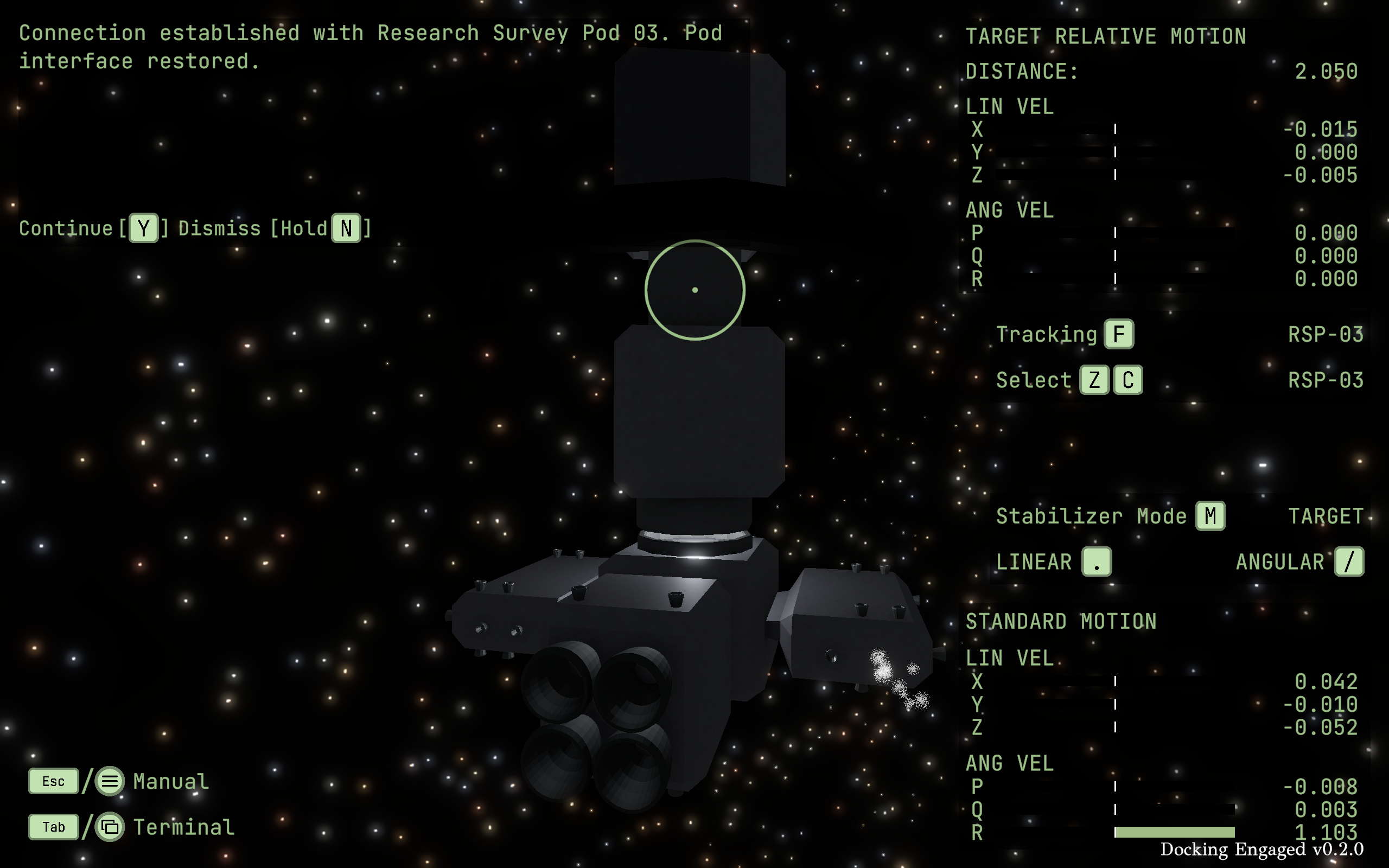 Docking under Extreme Conditions — Under the gravitational pull of a chaotic multi-body system, aligning docking ports is no easy task. Rely on your instincts, utilize all subsystems, and you will regain stability for your crew amid the insurmountable chaos of the universe.